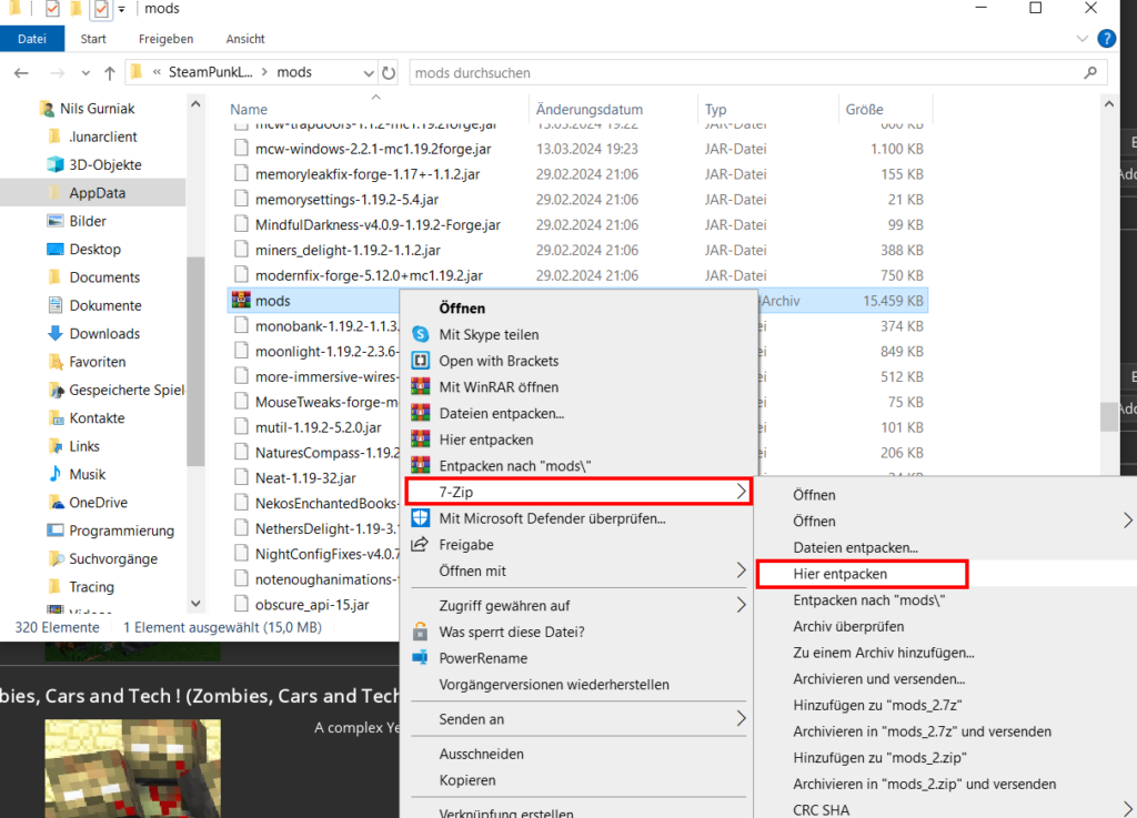 Entpacke hier die mods.zip mit der 7zip oder WinRarSoftware